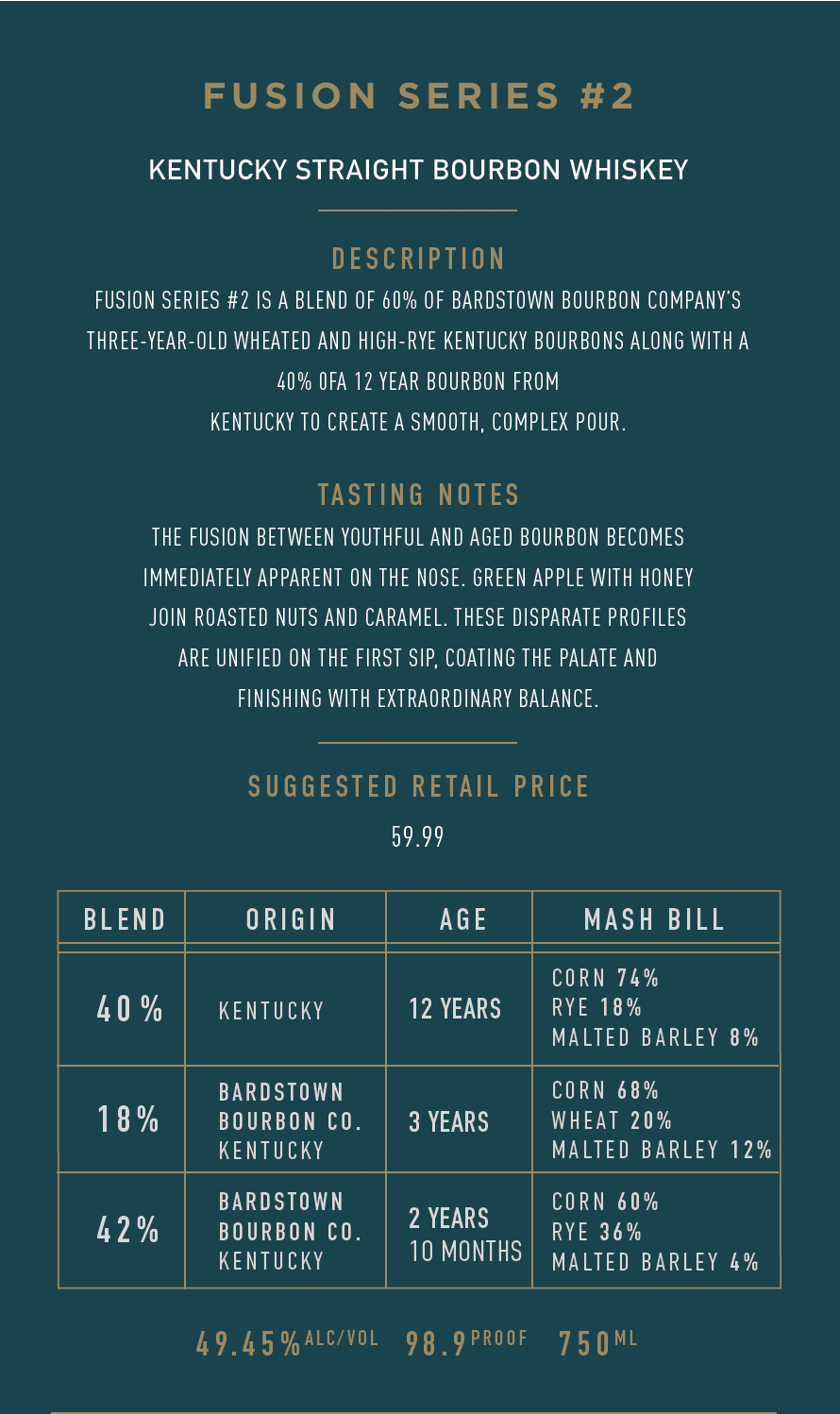 Fusion Series #2 is a blend of 60% of Bardstown Bourbon Company’s three-year-old wheated and high-rye Kentucky bourbons along with 40% of 12 year bourbon from Kentucky to create a smooth, complex pour.